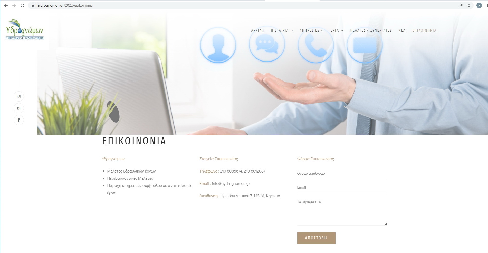 Η Υδρογνώμων λαμβάνοντας υπόψη τις ανάγκες της σύγχρονης εποχής και την πρόοδο της τεχνολογίας, που επιταχύνεται συνεχώς, αλλά και την ανάγκη για ταχύτερη και πιο άμεση ενημέρωση και επικοινωνία, αποφάσισε να προχωρήσει στη σχεδίαση και κατασκευή νέας ιστοσελίδας.